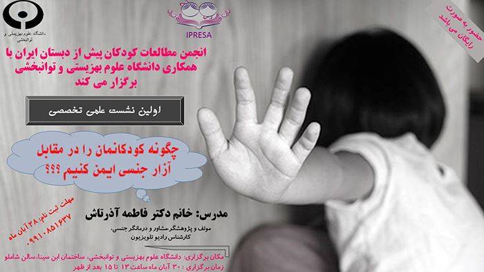 اولین کارگاه علمی تخصصی پیرامون سلامت و رشد کودکان با موضوع " تربیت جنسی کودکان "، روز چهارشنبه (30 آبان ماه جاری) به همت انجمن مطالعات کودکان پیش از دبستان ایران و انجمن علمی دانشجویی کودکان پیش از دبستان و با همکاری گروه آموزشی رشد و پرورش کودکان پیش از دبستان دانشگاه علوم بهزیستی و توانبخشی برگزار می شود.