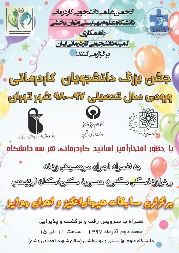 جشن بزرگ دانشجویان کاردرمانی ورودی امسال دانشگاه های شهر تهران، فردا در دانشگاه علوم بهزیستی و توانبخشی برگزار می شود