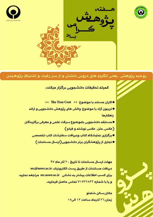 براساس اطلاعیه کمیته تحقیقات دانشجویی، برای انتخاب پژوهشگران برتر دانشجویی نیاز است تا دانشجویان فعال در زمینه پژوهش ، مستندات خود را تا تاریخ 20 آذرماه از طریق پست الکترونیکی به آدرس src@uswr.ac.ir برای کمیته تحقیقات دانشجویی ارسال کنند.