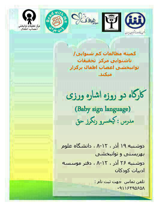 کارگاه آموزشی " اشاره ورزی "(زبان اشاره کودک)، روز دوشنبه – 19 آذرماه در دانشگاه علوم بهزیستی و توانبخشی برگزار می شود.