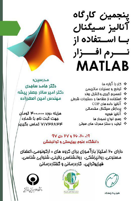 کارگاه پردازش سیگنال با استفاده از نرم افزار MATLAB، به همت شرکت دانش بنیان طنین پرداز پاسارگاد و شرکت دانش بنیان توان دانش مهرسام  که از سابقه  درخشان  در زمینه ارائه خدمات آموزشی، مهندسی و فنی به جامعه متخصصان و محققان حوزه های پزشکی و توانبخشی برخوردارند، برگزار می شود.