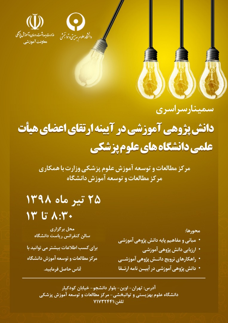 به گزارش وبدای دانشگاه علوم بهزیستی و توانبخشی، این سمینار سراسری توسط مرکز مطالعات و توسعه آموزش علوم پزشکی وزارت بهداشت و با همکاری مرکز مطالعات و توسعه آموزش دانشگاه علوم بهزیستی، از ساعت 8:30 تا 13 برگزار خواهد شد.