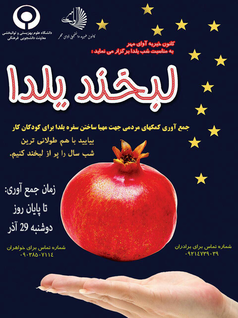 اخبار > کانون خیریه آوای مهر به مناسبت شب یلدا برگزار می کند: جمع آوری کمک های مردمی جهت مهیا ساختن سفره یلدا برای کودکان کار