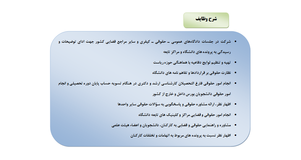 صفحه اصلي > درباره دانشگاه > ریاست دانشگاه > اداره امور حقوقي > شرح وظایف اداره امور حقوقی